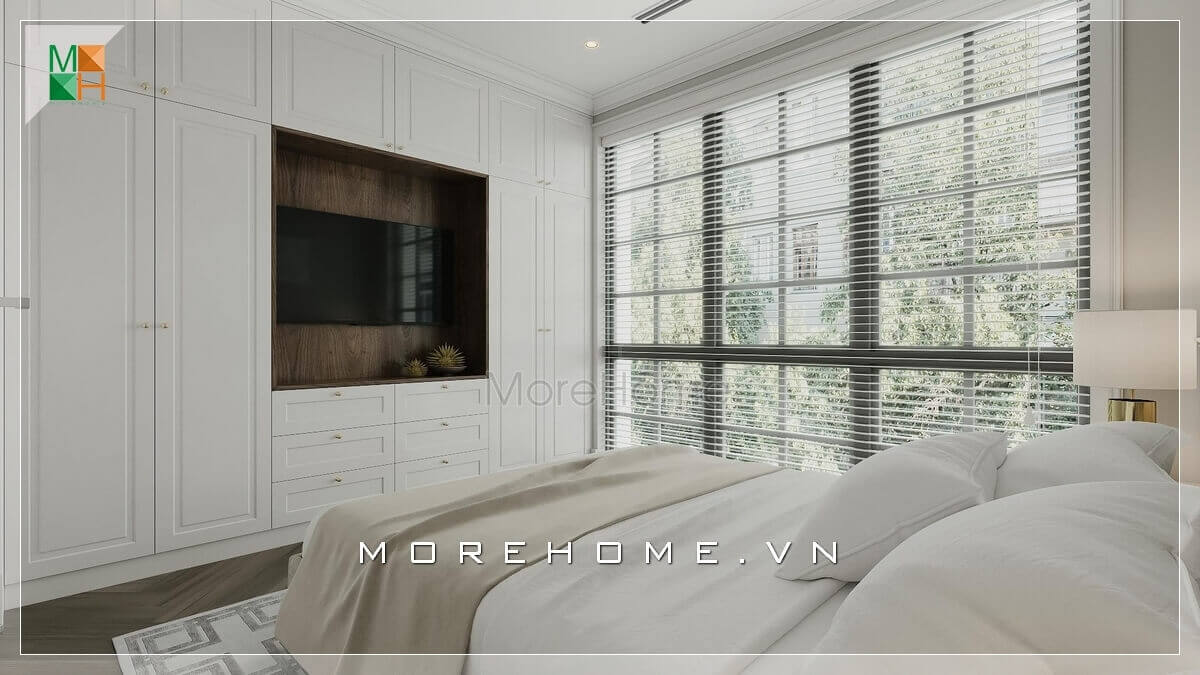 Thiết kế phòng ngủ với mảng tường kính lớn thoáng đãng, hiện đại cho một không gian thư giãn thoải mái, gần gũi phù hợp cho không gian biệt thự.