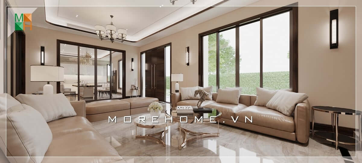 Thiết kế không gian phòng khách tân cổ điển rộng và đẳng cấp với mẫu bàn ghế phòng khách bàn gỗ tự nhiên cao cấp, ghế sofa bọc da sang trọng.