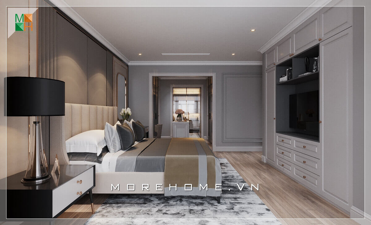Có lẽ điểm nổi bật nhất trong căn phòng ngủ chung cư đẹp chính là cái giường ngủ mang đậm chất tân cổ điển thiết kế đầu giường uốn lượn mềm mại. Nội thất trong phòng ngủ như kệ giá sách, bàn làm việc, tranh canvas treo đầu giường đến từng chi tiết nhỏ như đèn ngủ hay đèn treo trần tất cả đều sắp xếp rất ngăn nắp và hợp lý.