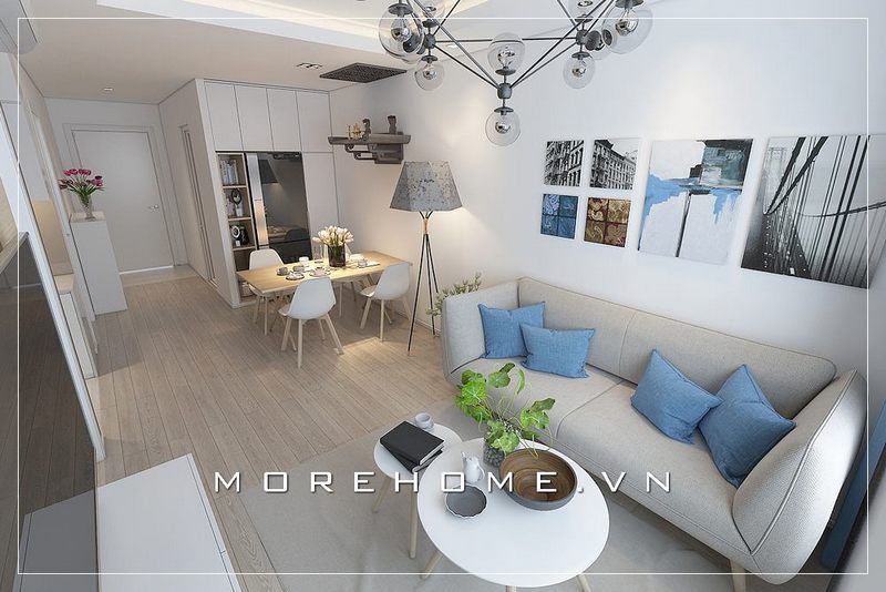 Thiết kế chung cư hiện đại,khu vực sinh hoạt chung được thiết kế liền kề, phần cửa hướng ra ban công kích thước lớn mang lại ánh sáng và không khí trong lành cho căn phòng bớt ngột ngạt