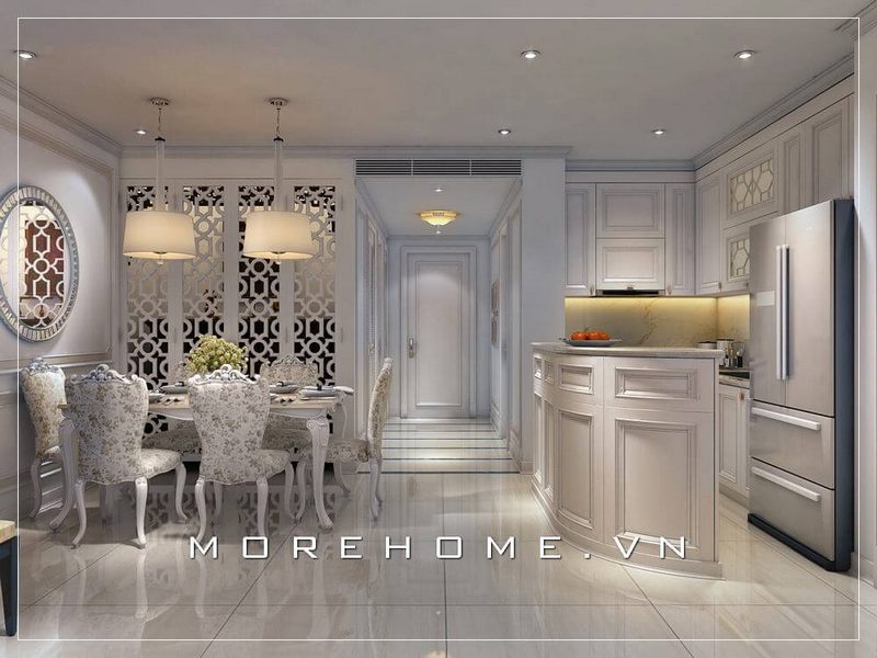 Thiết kế nội thất phòng bếp nhỏ theo phong cách tân cổ điển sang trọng và tiện nghi