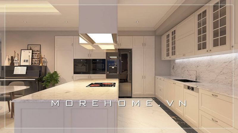 Thiết kế nội thất phòng bếp gỗ tự nhiên sử dụng tone màu trắng chủ đạo kết hợp đường nét tân cổ điển tinh tế giúp không gian căn phòng sang trọng và đẳng cấp hơn
