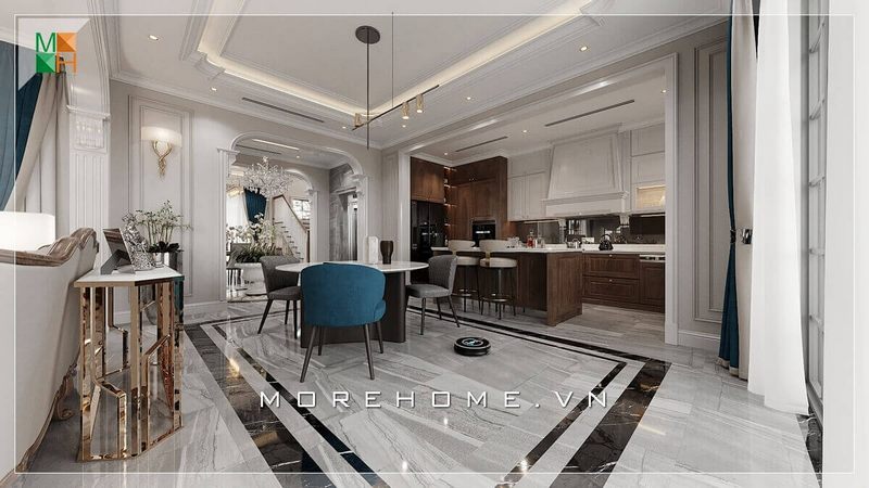 Thiết kế nhà phố cao cấp bố trí phòng ăn liền phòng bếp sử dụng nội thất sang trọng trong một không gian mở tôn lên giá trị cho ngôi nhà.